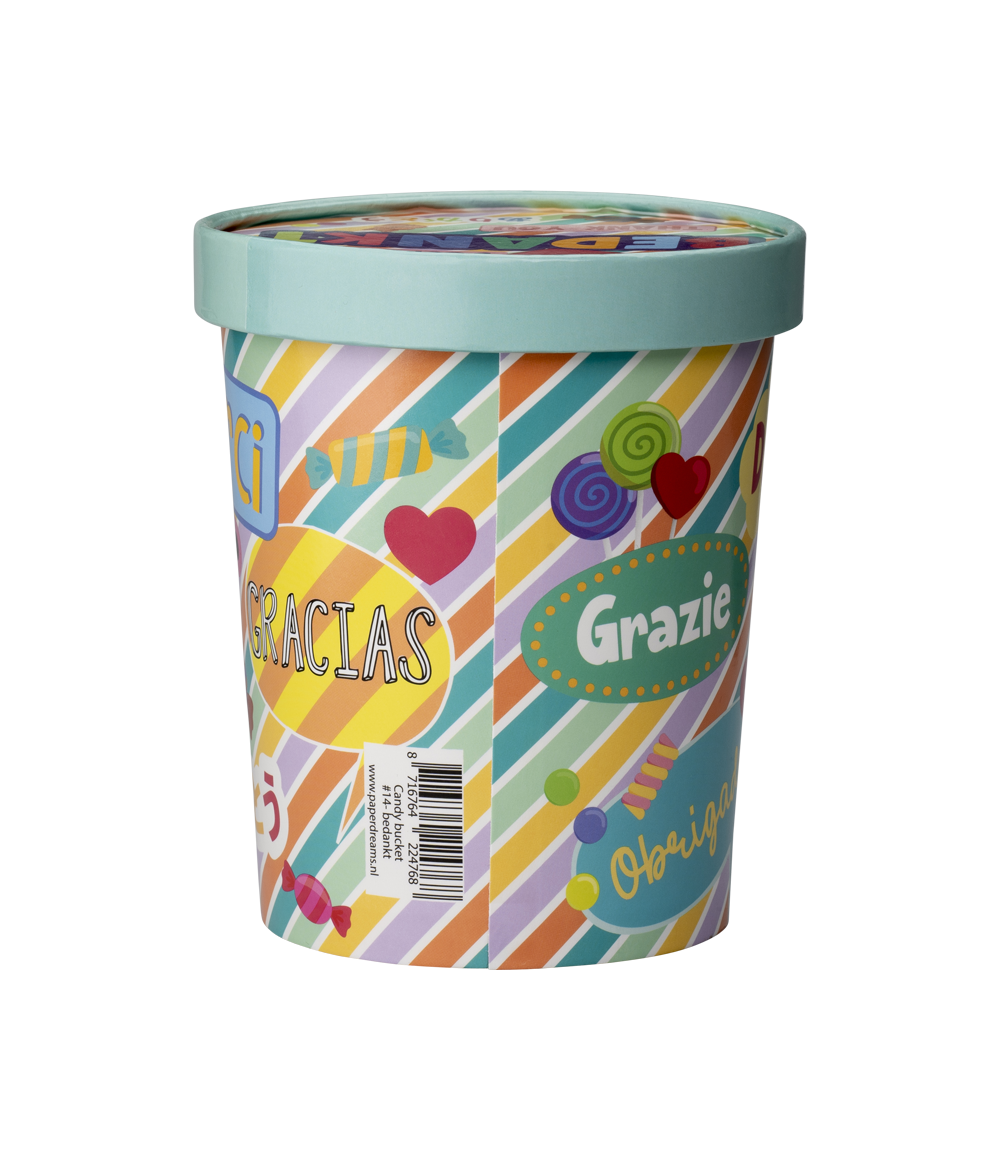 De vrolijke candy buckets zijn een echte eyecatcher in de winkel. Mede door het leuke design is deze candy bucket erg leuk om te krijgen. De snoepemmers zijn gemaakt van karton!