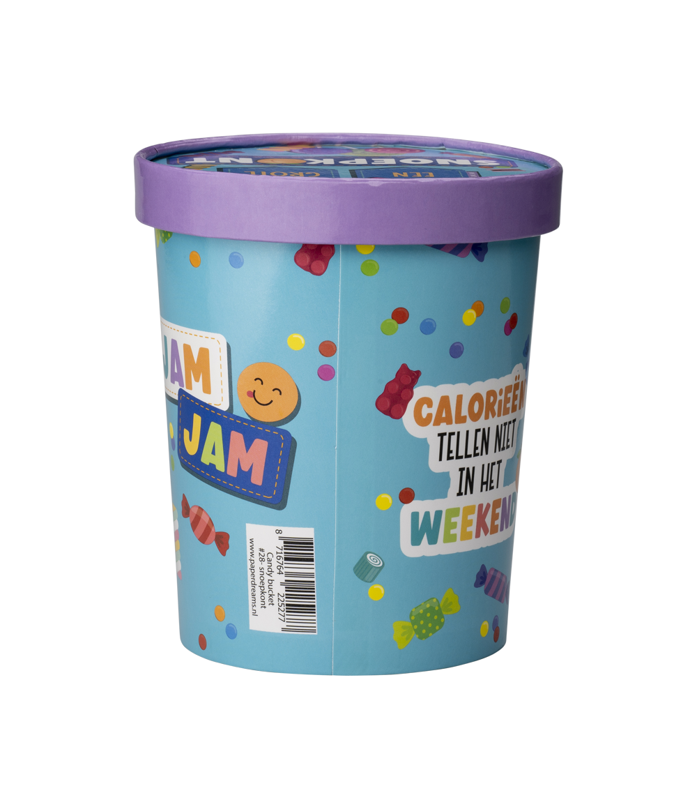 De vrolijke candy buckets zijn een echte eyecatcher in de winkel. Mede door het leuke design is deze candy bucket erg leuk om te krijgen. De snoepemmers zijn gemaakt van karton!