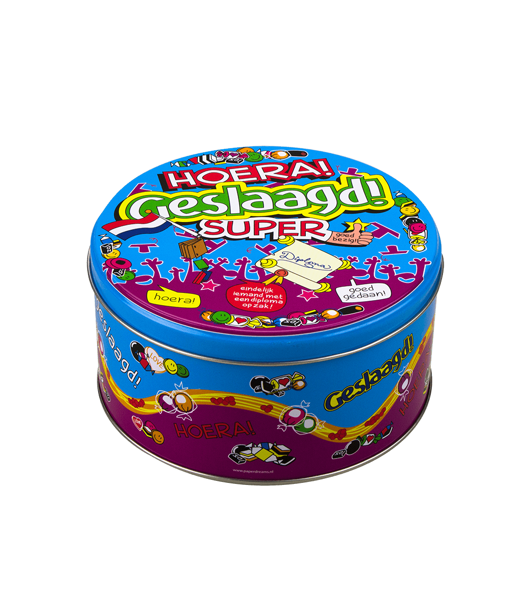 Verpakkingsinhoud: Snoeptrommel Geslaagd School 14cm