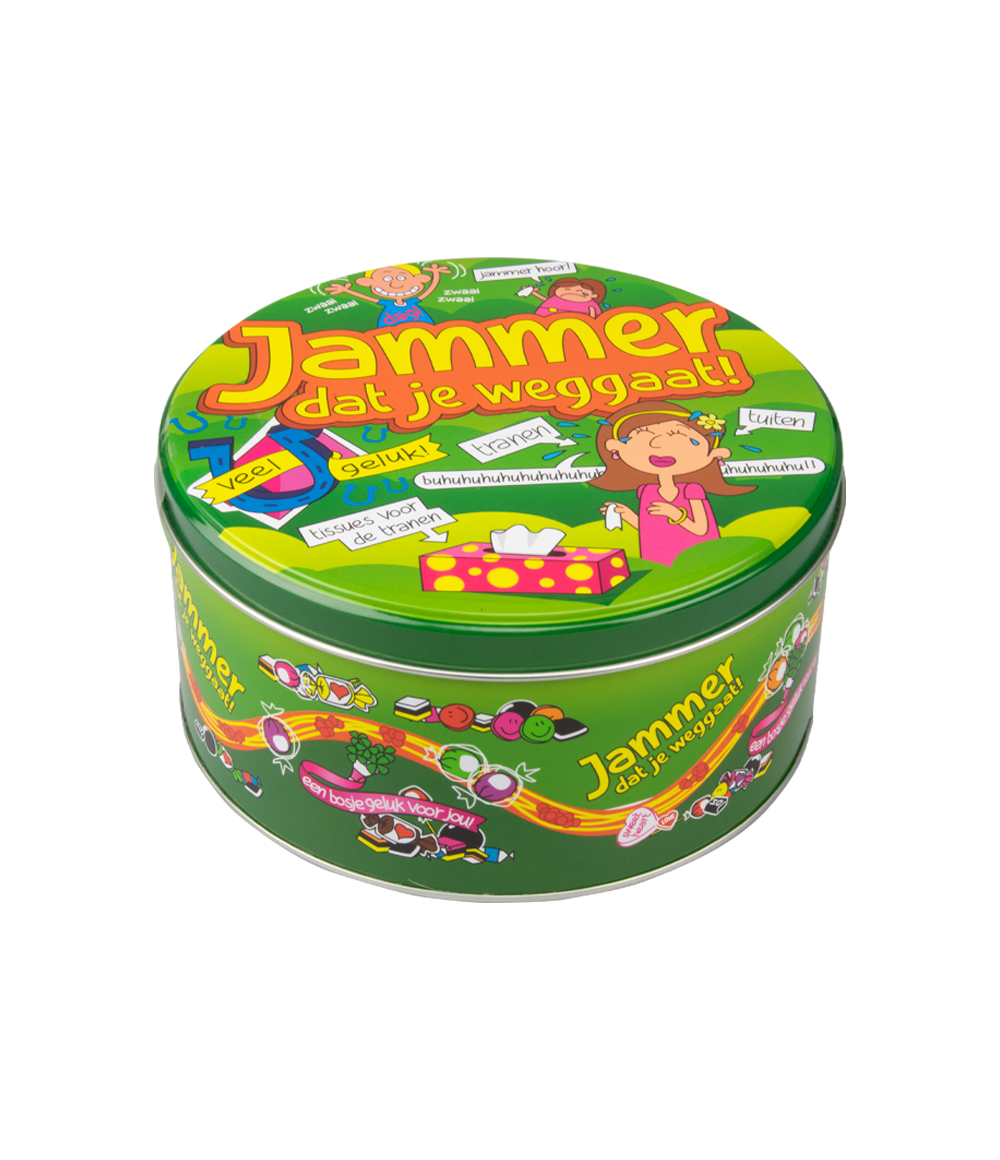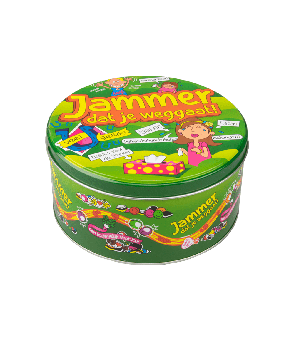 Deze snoeptrommel met grappige cartoontekening is erg leuk om cadeau te geven