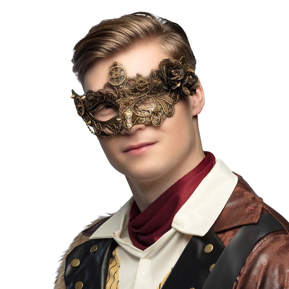 Dit mooie koperkleurige oogmasker is de perfect toevoeging aan een stoere en industriële Steampunk look. Dit steampunk masker heeft een luxe uitstraling en is versierd met tandwieltjes en een bloem. Een onmisbaar accessoire voor een avontuurlijk Steampunk kostuum voor een cosplay-evenement, Carnaval of een themafeest.