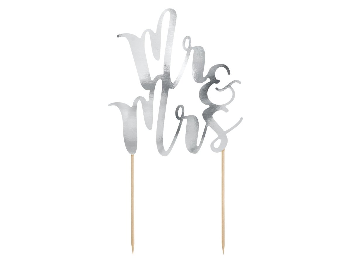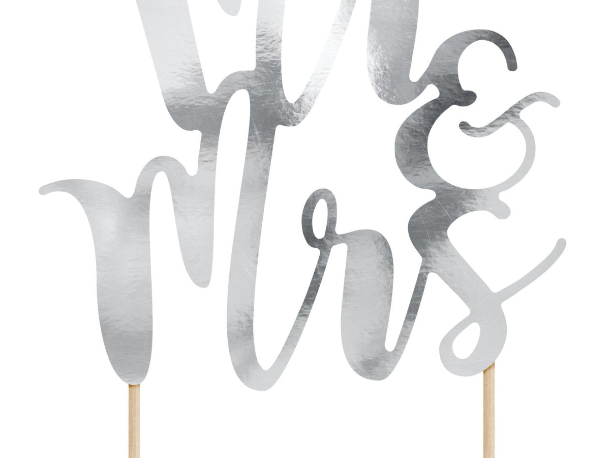Inhoud: Cake topper Mr & Mrs, gemaakt van zilver spiegel papier, lengte ong. 25,5 cm.
