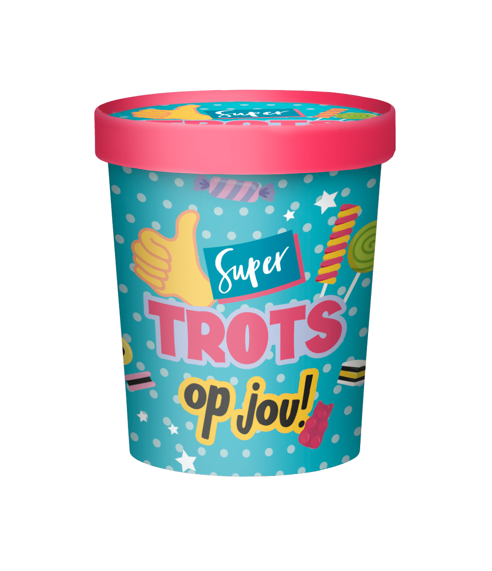 De vrolijke candy buckets van Paper Dreams zijn een echte eyecatcher in de winkel. Mede door het leuke design is deze candy bucket Trots op jou erg leuk om te krijgen. De snoepemmers zijn gemaakt van karton.