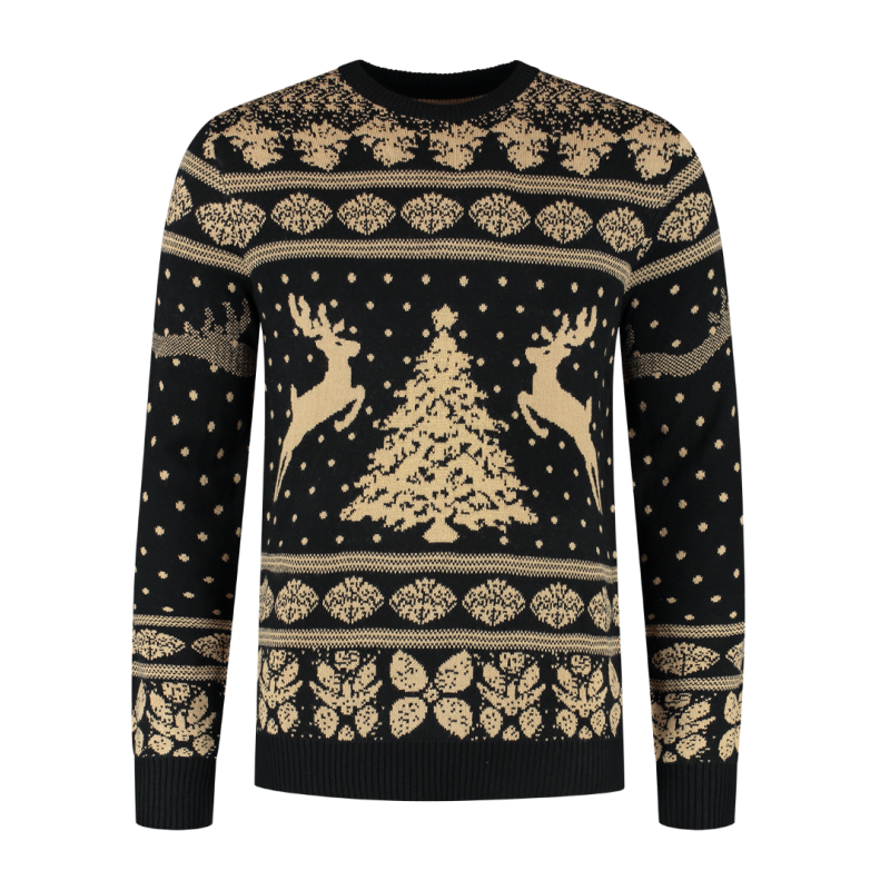 Deze Jumping Reindeer kersttrui combineert een moderne look met een feestelijk tintje. De trui is uitgevoerd in zwart en versierd met een stijlvol goudkleurig rendiermotief, waardoor hij een luxe en toch speelse uitstraling heeft. Perfect voor wie een feestelijke trui wil die nét wat chiquer oogt dan de klassieke kerstprints.