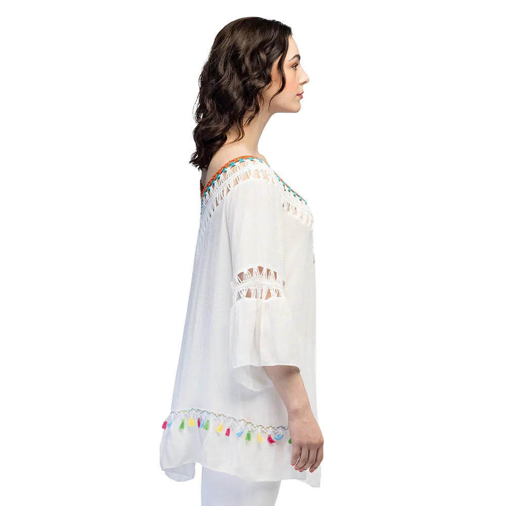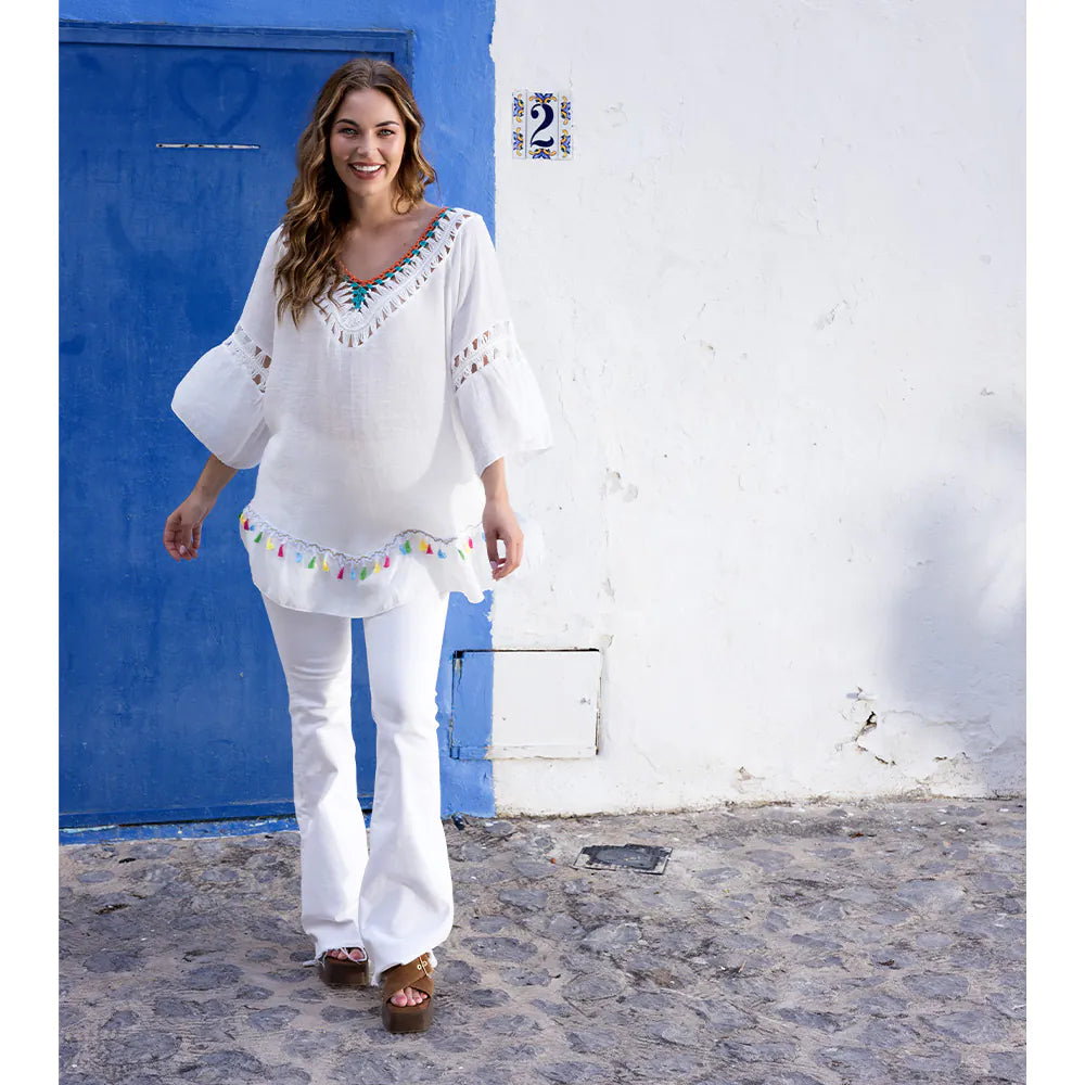 Deze zomerse witte tuniek is ideaal voor een relaxte dag aan het strand, een wandeling door de stad of als boho outfit voor een zomers festival. De luchtige stof zorgt voor een comfortabele pasvorm en de kleurrijke details langs de hals en onderkant geven de tuniek een extra zomerse uitstraling. Beschikbaar in één standaard maat voor dames.
