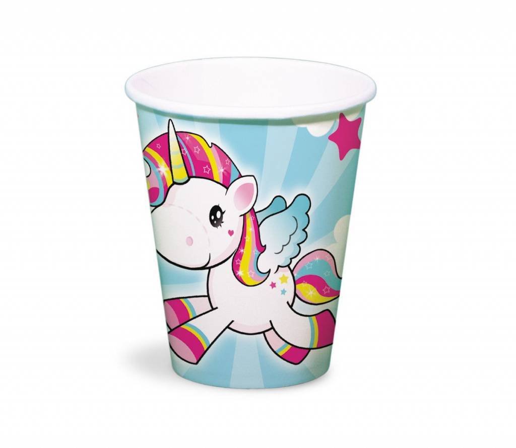 Eenhoorn Bekers 250ml - 8 stuks. Inhoud: 8 bekers. Kleur: Meerkleurig. Bijvoorbeeld te gebruiken tijdens de volgende feestgelegenheid/feestgelegenheden: Kinderfeestje. Een beker heeft een inhoud van 250 ml. Het artikel is gemaakt van karton.
