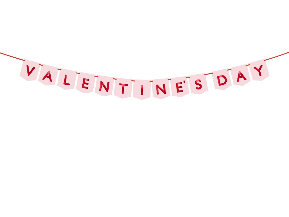 Banner Valentijnsdag van papier in roze kleur met opschrift in rode kleur, afmeting ca. 150 x 13 cm, lengte touw ca. 2,5 m.