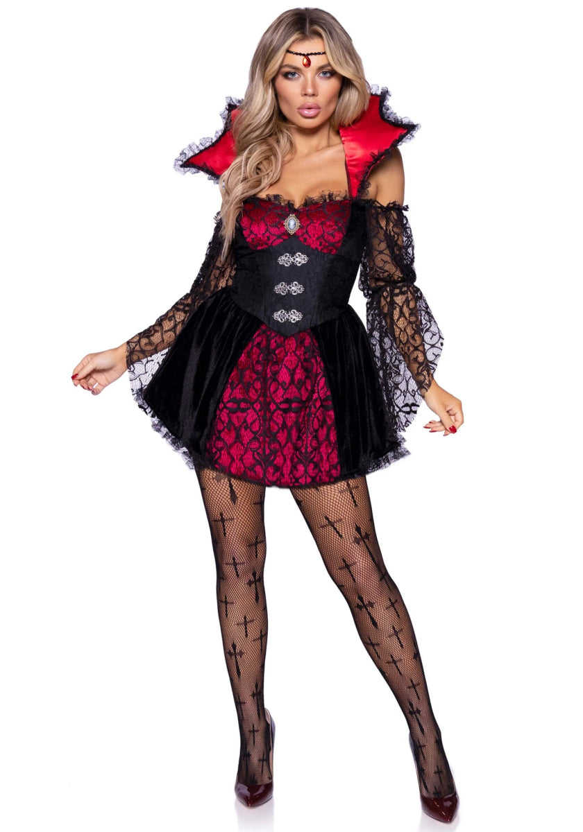 Jouw hypnotiserende uitstraling maakt elke prooi weerloos, waardoor jouw dodelijke kus onweerstaanbaar wordt. Dit betoverende 2-delige Leg Avenue kostuum bestaat uit een donkere, sexy kanten jurk met dramatische klokmouwen, een taille-cincher met gespsluiting en een sierlijke cameo. De geschulpte opstaande kraag en het met juwelen versierde hoofdsieraad geven jouw vampierlook een koninklijke touch. 🩸✨