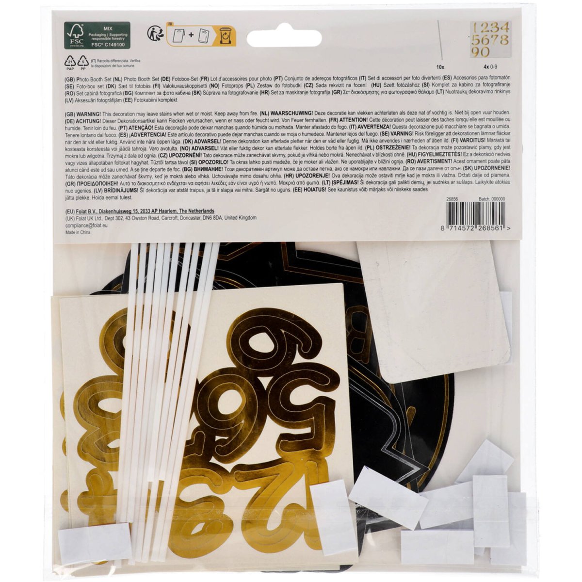 Foto's graag! Photobooth Set - Shining Glam - 10 stuks. Inhoud: 10 photobooth props. Bijvoorbeeld te gebruiken tijdens de volgende feestgelegenheid/feestgelegenheden: Verjaardag. Deze photobooth props zijn leuk op elke foto.Er zijn 10 props, allemaal met glanzend gouden details. Op 2 ruimte is er ruimte om zelf de leeftijd te plakken met de bijgeleverde glanzend gouden stickers: 4x 0 t/m 9 van ongeveer 3,5 cm hoog. Er zitten 10 stokjes bij die met het bijgesloten dubbelzijdige tape aan de props bevestigd kunnen worden. Deze photobooth props horen bij onze Shining Glam collectie. Dit artikel is gemaakt van papier.