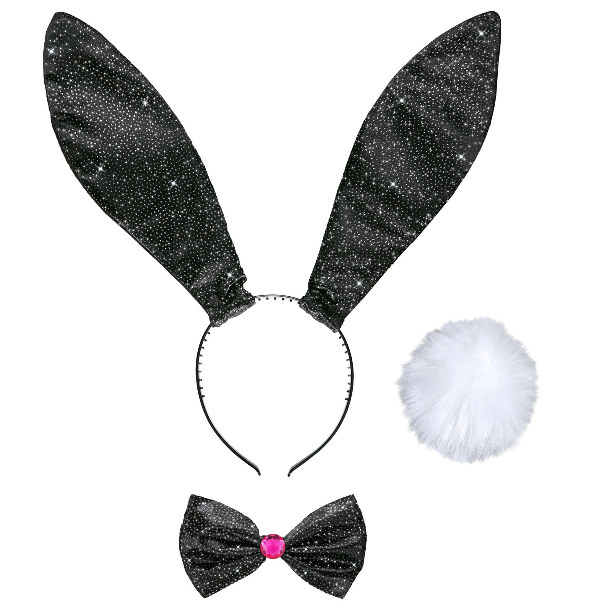 Omschrijving: zwart glitter konijntje verkleedset, strikje, staart