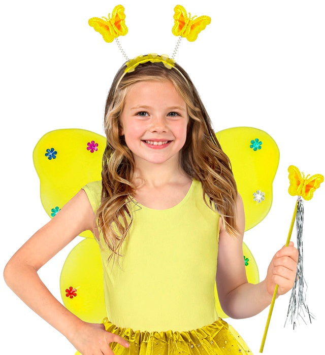 Laat kinderen zich transformeren in een betoverende vlinder met deze complete gele set, perfect voor verkleedfeestjes, thema-evenementen of fantasierijk rollenspel.