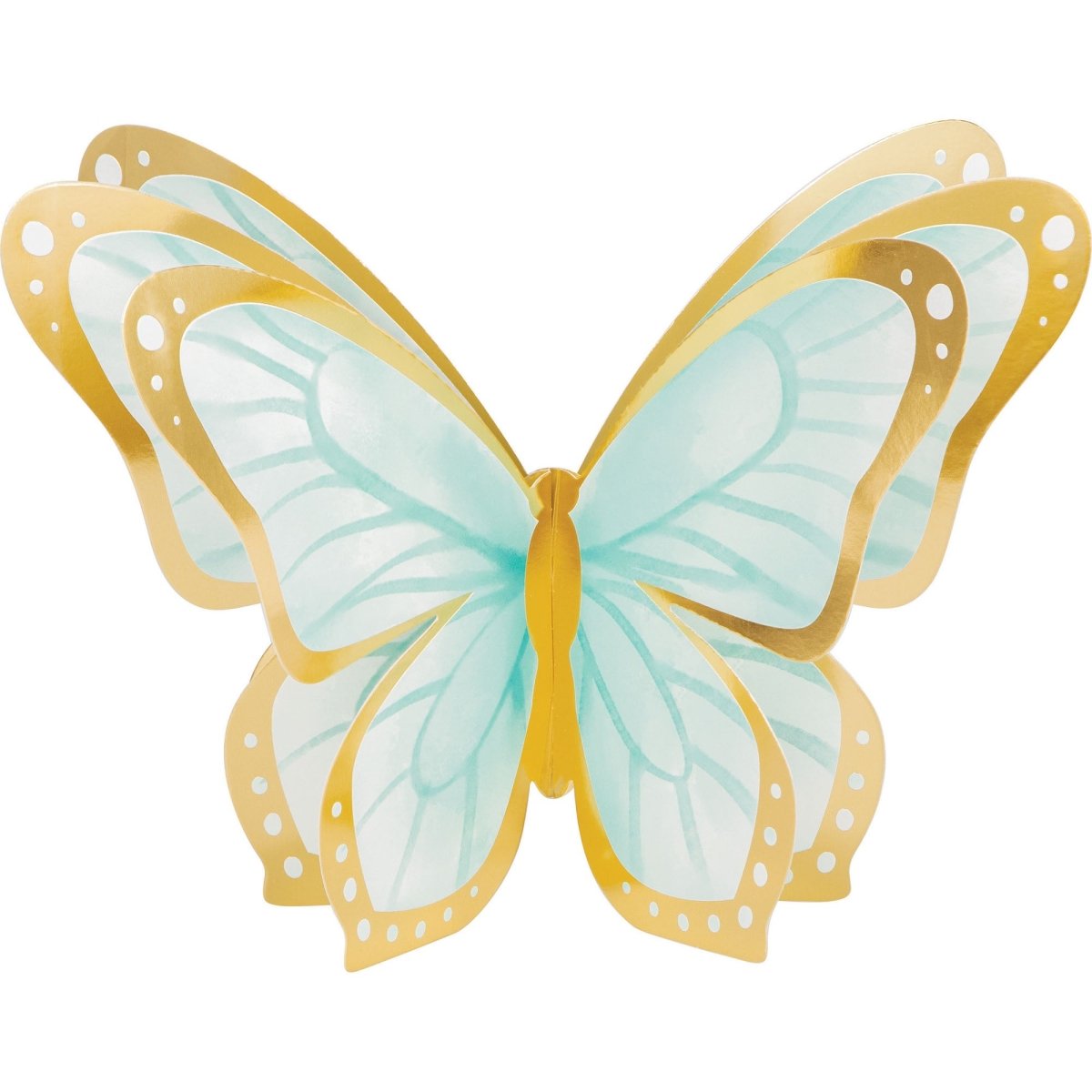 Deze driedelige middelpuntset bevat 3D-vlinders, een van 23 x 30 cm en de andere twee van 18 x 25 cm. De prachtige pastelkleurige vlinders waaieren uit om 3D te worden, zodat ze vrijstaand op de feesttafel kunnen staan. De paarse, roze en aqua-vlinders worden elk geaccentueerd door details van metallic goudfolie.
