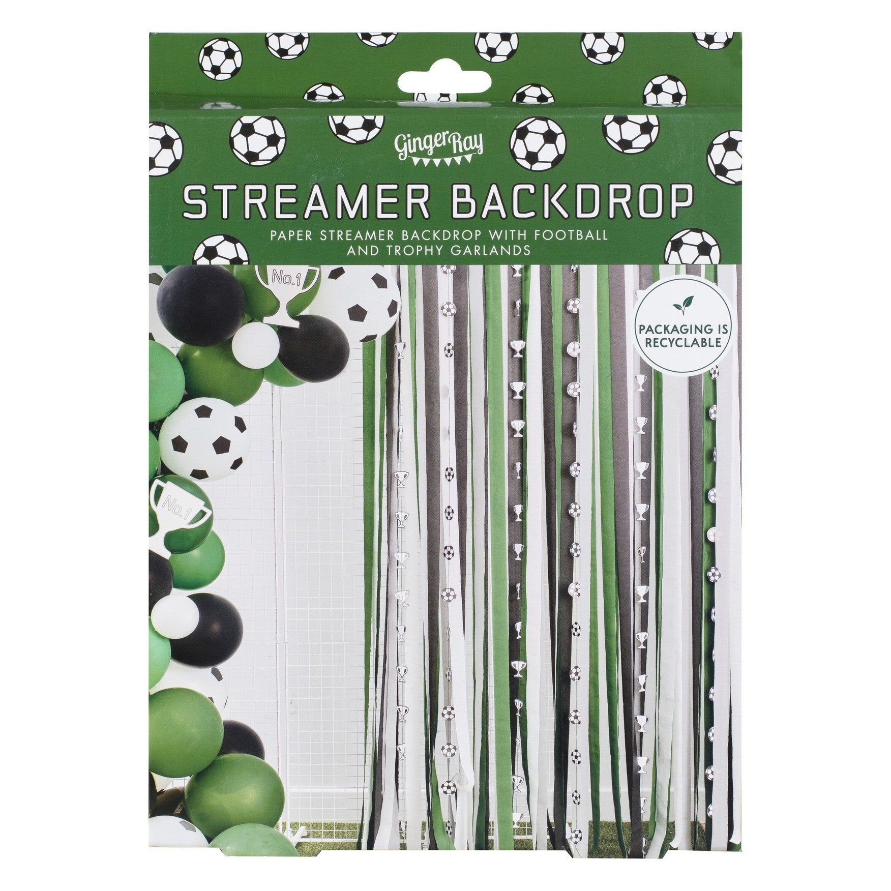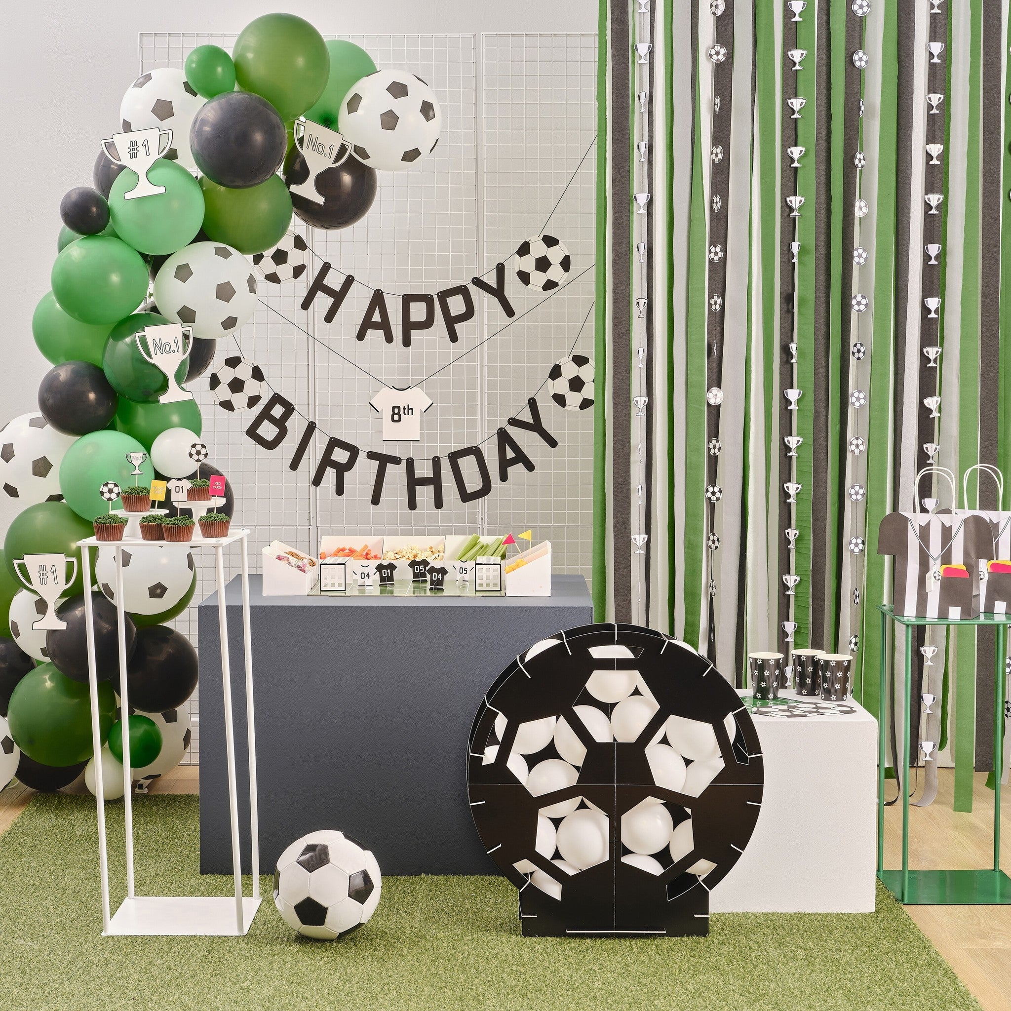 Match deze feest achtergrond met voetbal feest decoraties uit onze nieuwe 'Kick off the Party' assortiment met ballonnen, servies, gors, accessoires en nog veel meer!