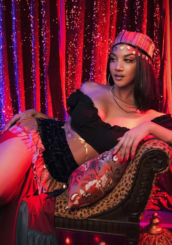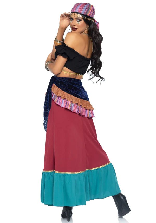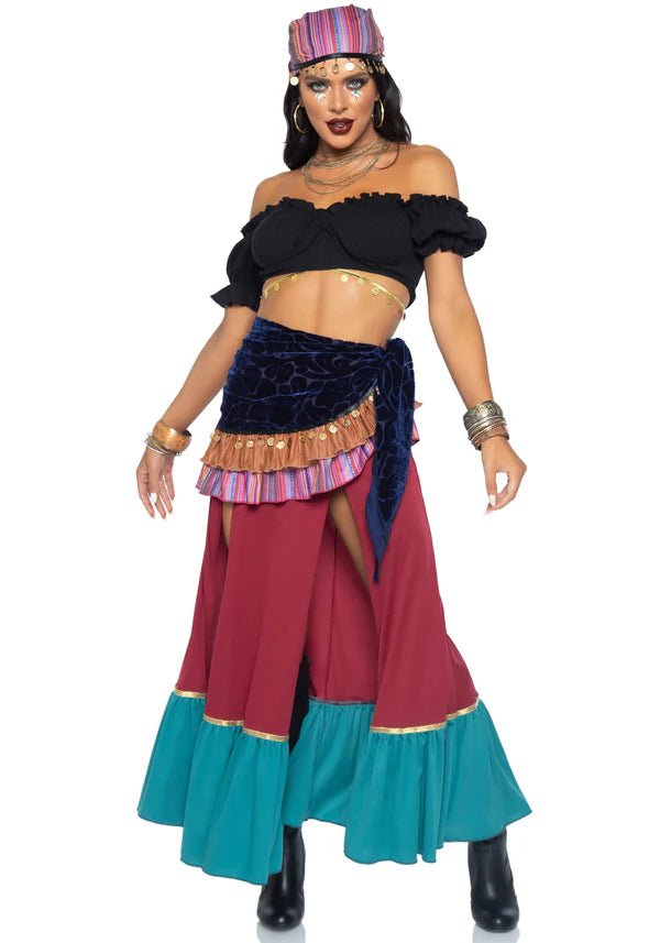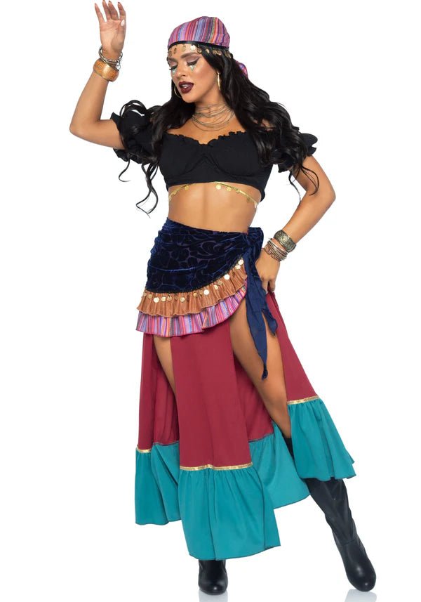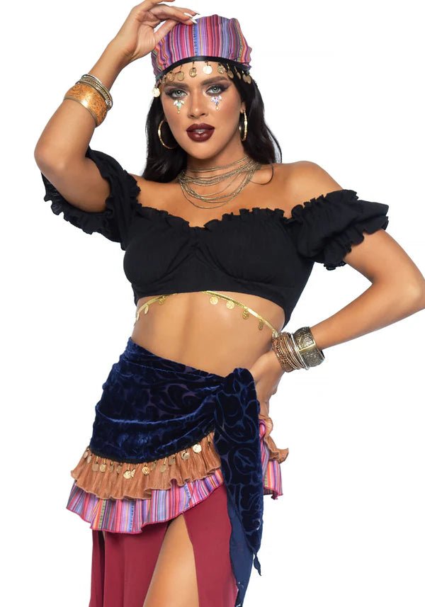 Ontketen de betovering in dit 3-delige Crystal Ball Beauty kostuum van Leg Avenue! Dit sexy zigeunerin kostuum bestaat uit een cropped top met hoofddoek afgezet met muntjes, een rok met dubbele split en een fluwelen sjerp met ruches. Perfect voor Halloween, carnaval of een themafeest waar je je magische kant wilt laten zien! 💫🌙