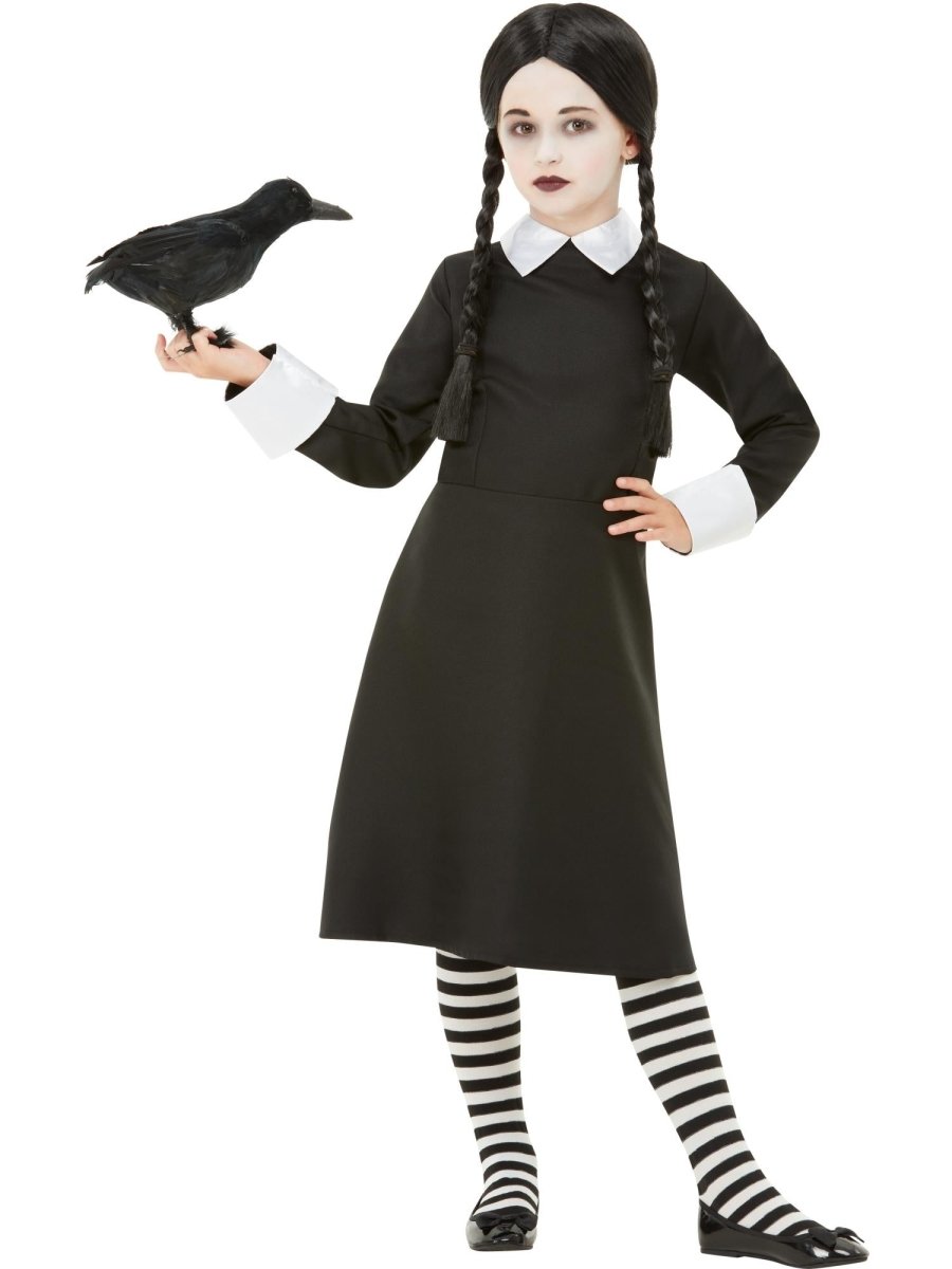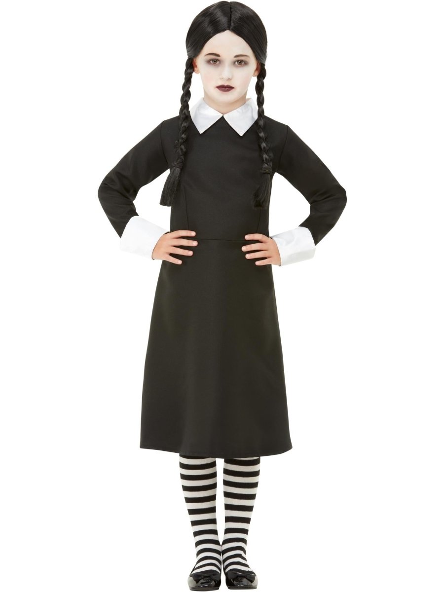Verkleed je kind als een stijlvolle gothic schoolmeisje met dit elegante zwarte kostuum. Perfect voor Halloween, themafeesten of rollenspellen. Verpakkingsinhoud: JurkDoelgroep: KinderenKleur: Zwart