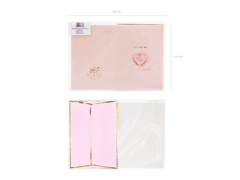Kaart in roze kleur met goud-metallic opdruk met ge‘mailleerde speld in de vorm van een hart met inscriptie Mam en roze envelop met goud-metallic opdruk, formaat kaart ca. 10,5 x 14,8 cm, formaat ge‘mailleerde speld ca. 3 x 2,7 cm.