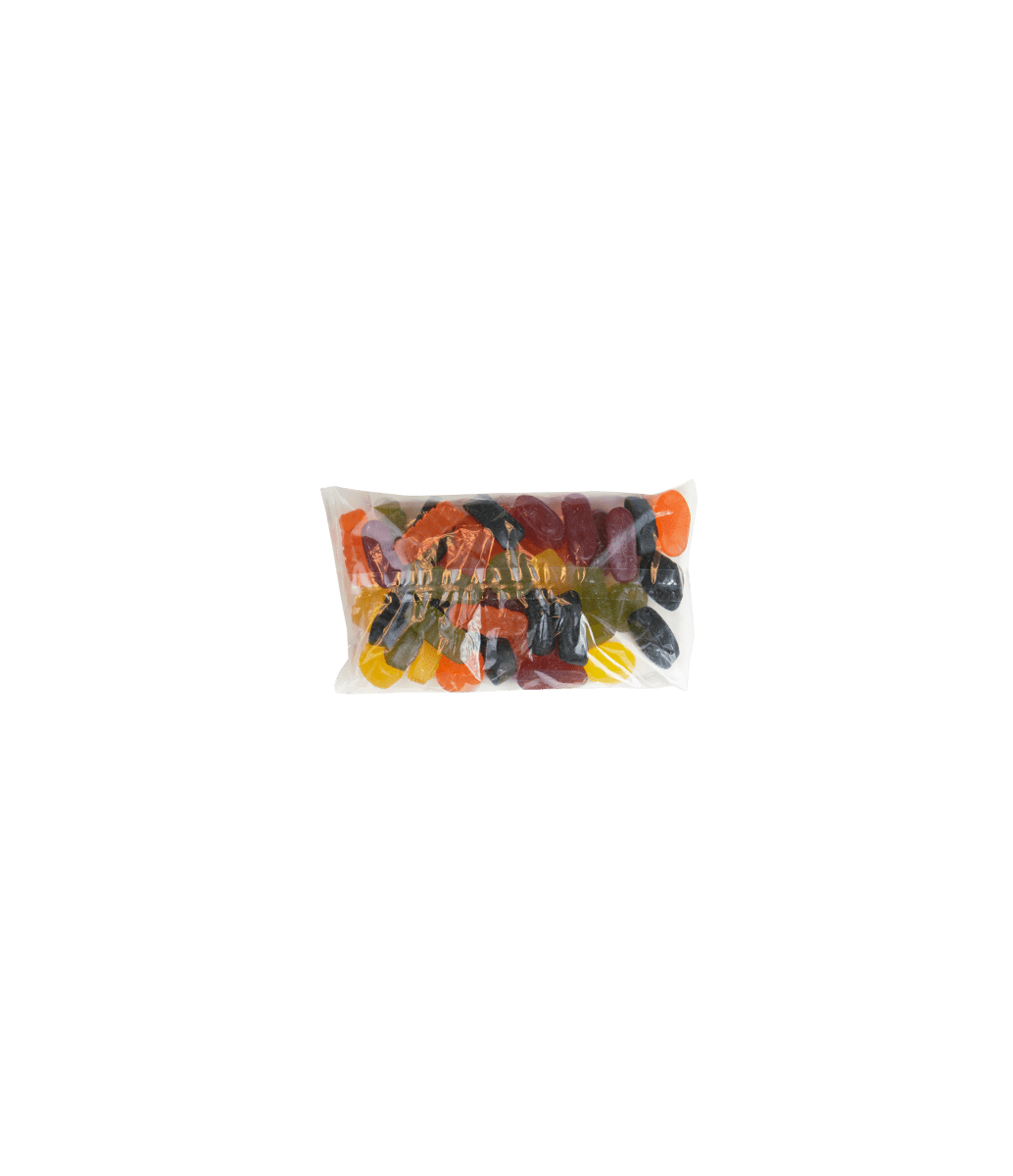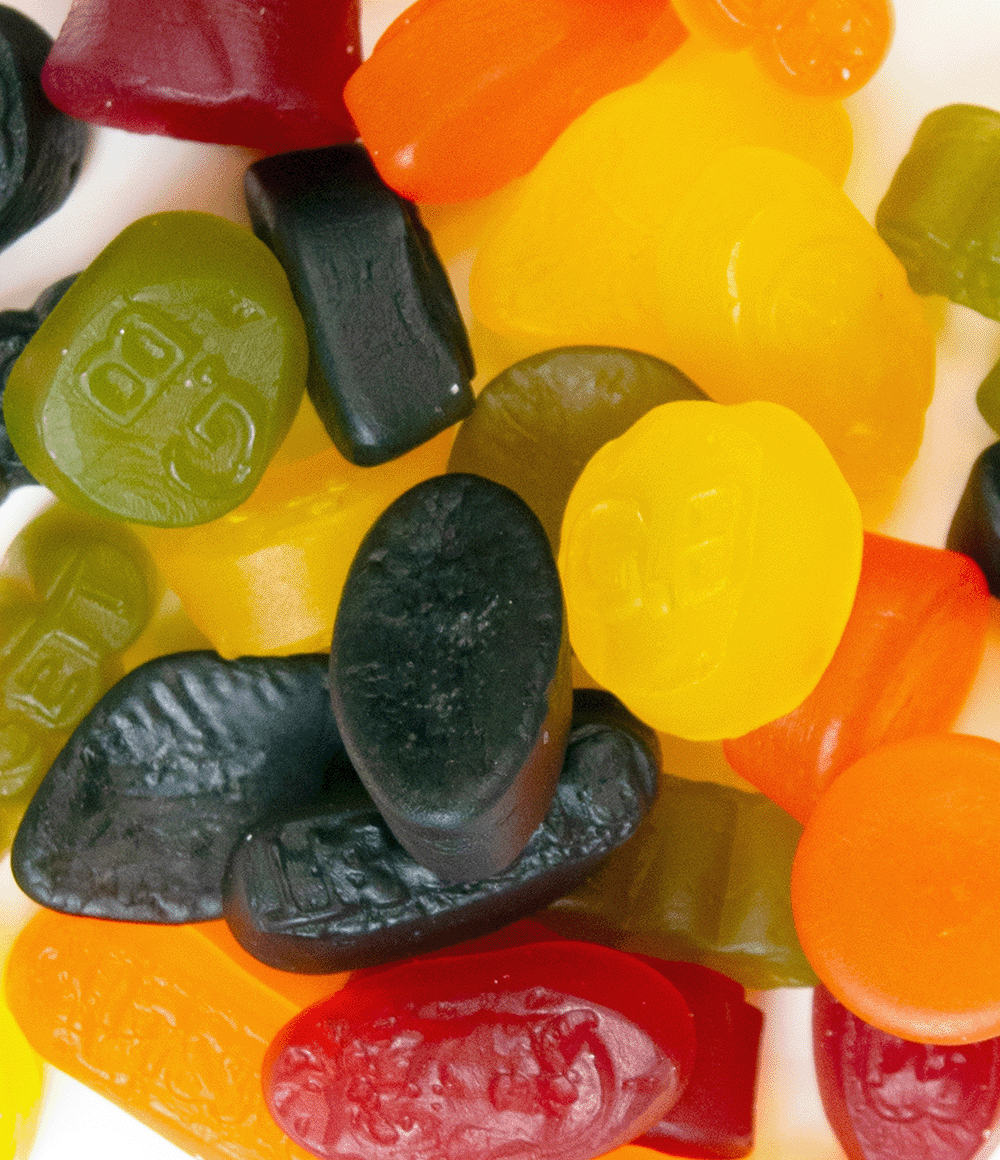 Ingrediënten (voorbeeld, aanpassen naar jullie recept): glucosesiroop, suiker, zetmeel, water, gelatine, voedingszuren, aroma’s, kleurende voedingsmiddelen en kleurstoffen.