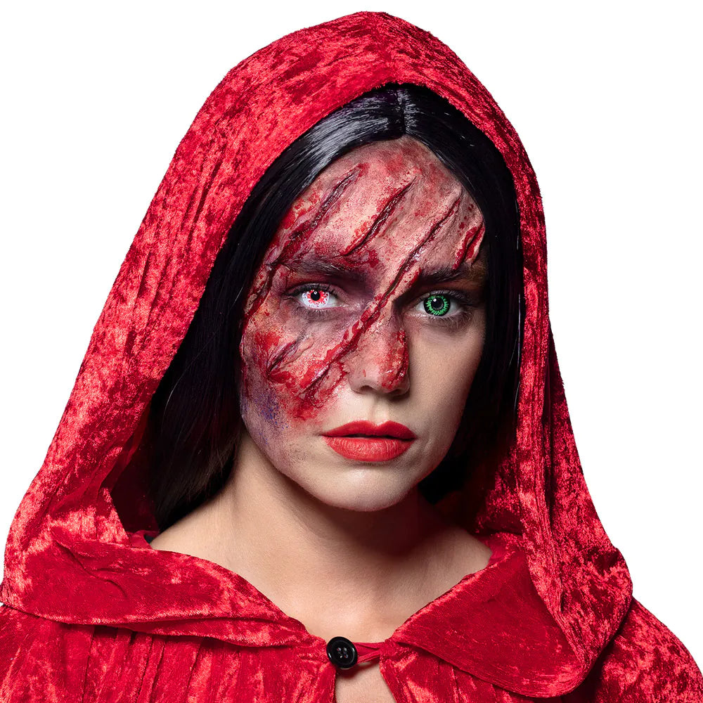 Deze duolenzen zijn opvallend: het is een set van 1 bloederige en 1 groene lens. Het contrast tussen deze 2 lenzen maakt je Halloween outfit nog spannender en enger. Perfect te gebruiken als iemand die aangevallen is door een wolf en daardoor transformeert naar een evil meisje, maar laat vooral zelf je fantasie de vrije loop en jaag mensen de stuipen op het lijf met deze opvallende combi. Deze zachte lenzen zonder sterkte zijn 3 maanden te gebruiken, dus ook na het feest kun je nog eens mensen shockeren met 2 verschillende ogen.