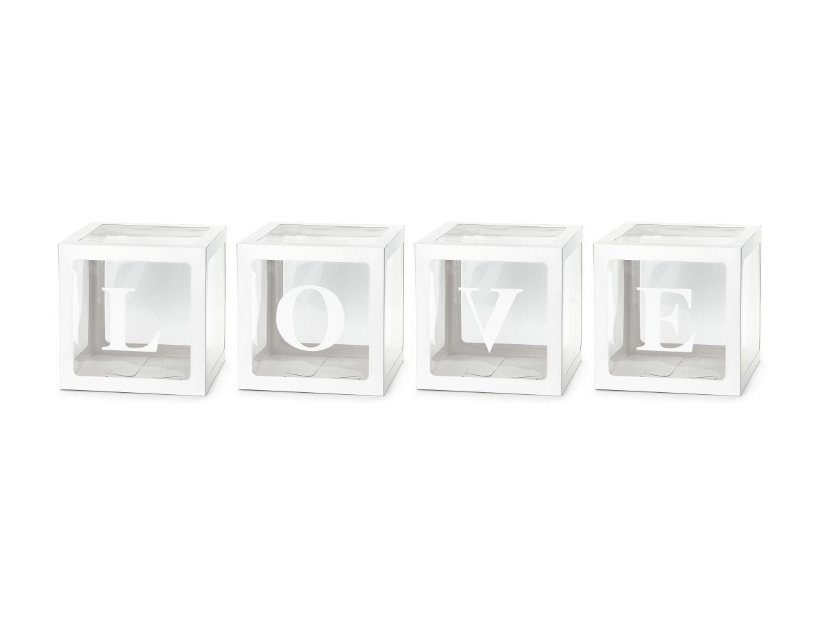 Set van 4 ballondozen met plakletters LOVE in witte kleur. Formaat na montage ca. 30 x 30 cm. Doe-het-zelf product.