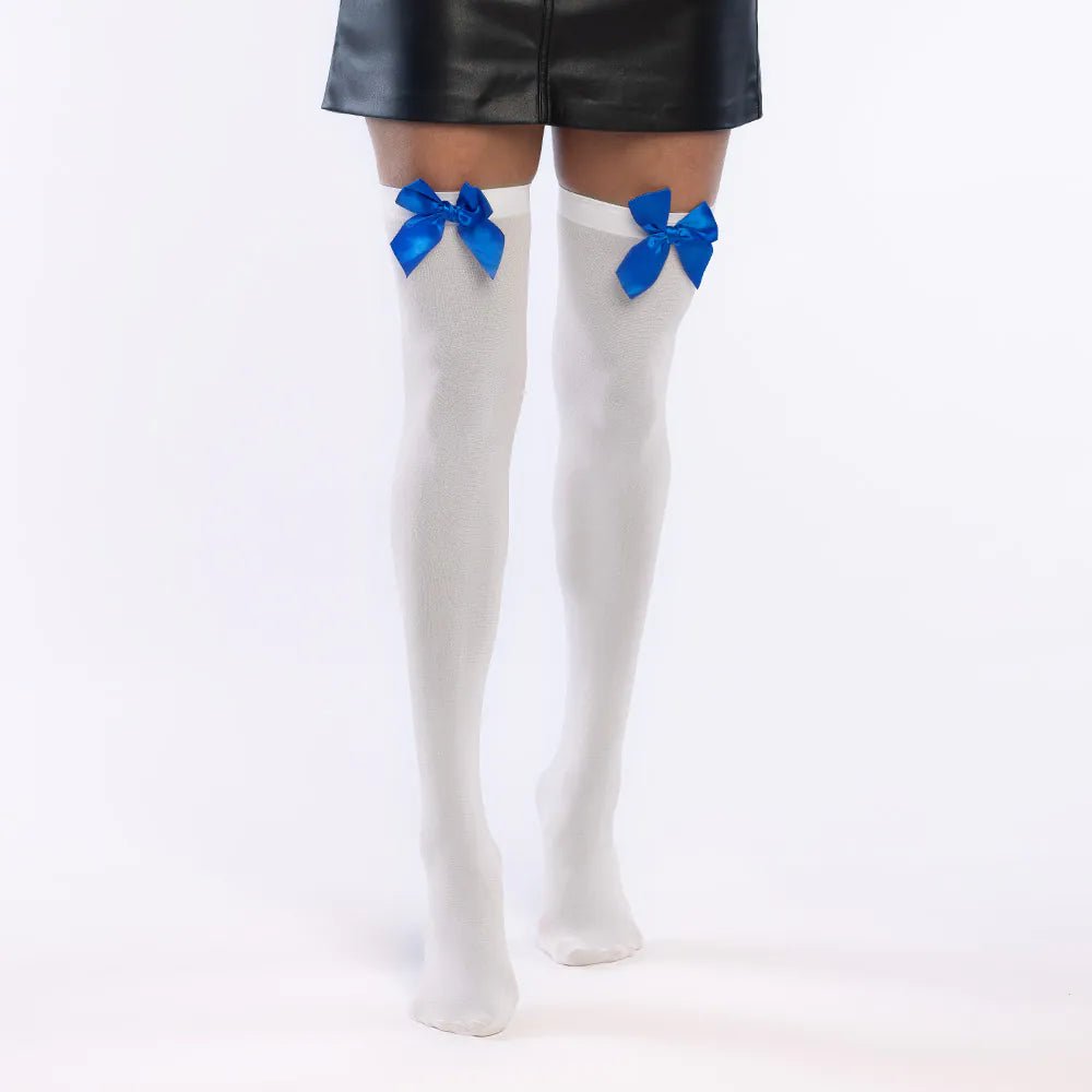 Deze witte kousen met satijnen blauwe strikken geven jouw outfit een vrolijke en ondeugende twist. Ideaal voor verkleedpartijen als schoolmeisje, sprookjesfiguur of wanneer je gewoon van opvallende details houdt – dit accessoire steelt gegarandeerd de show!