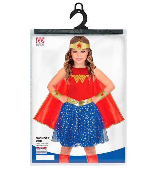 Transformeer in een heldhaftige heldin met dit Wonder Girl-kostuum in rood en blauw. De set bestaat uit een jurk met cape, bijpassende manchetten en een hoofddeksel, waardoor de look compleet is. Ideaal voor themafeestjes, verkleedpartijen of cosplay-evenementen. De verpakking bevat 1 Wonder Girl-kostuum inclusief jurk met cape, manchetten en hoofddeksel.
