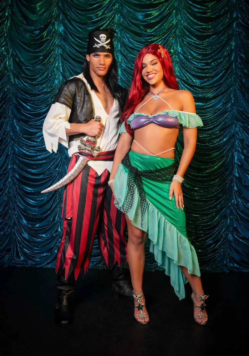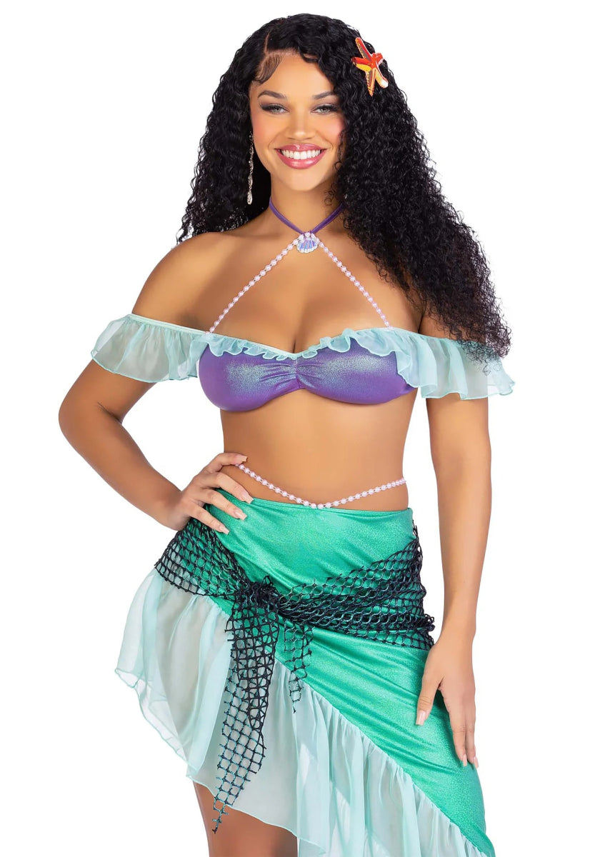 Transformeer in een betoverende zeemeermin met de 3-delige Zeemeermin set van Leg Avenue! Deze magische ensemble bevat een parel halter iriserende beha-top met chiffon ruffles, waardoor je een elegante zeemeermin uitstraling krijgt. De asymmetrische rok heeft een parel tailleband en een iriserend netwikkel, wat zorgt voor een betoverend en magisch effect dat je naar de diepten van de oceaan zal brengen.