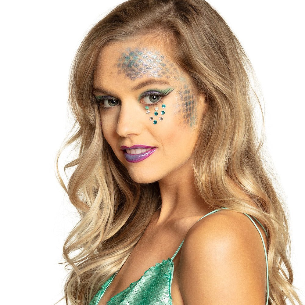 Verpakkingsinhoud: Make-up kit Zeemeermin sjabloon, stickervel met 14 edelstenen, vetschmink, glittergel en spons