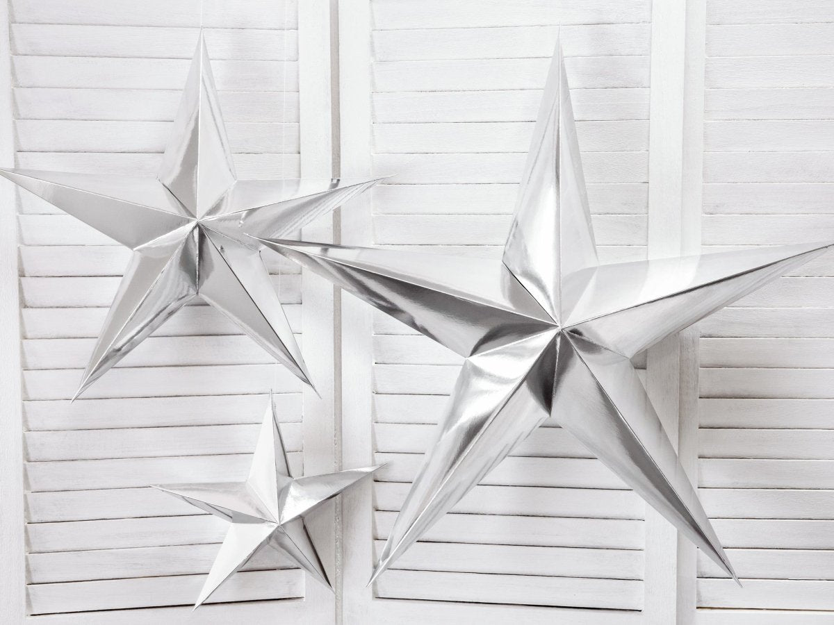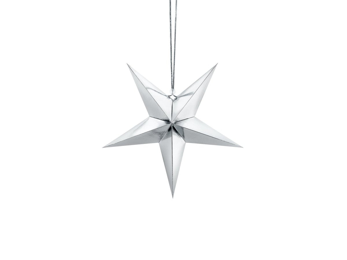 Inhoud: Papier ster, vijf punt, gemaakt van spiegel zilver papier, met zilveren touw, diameter ong. 30 cm. Doe het zelf product.