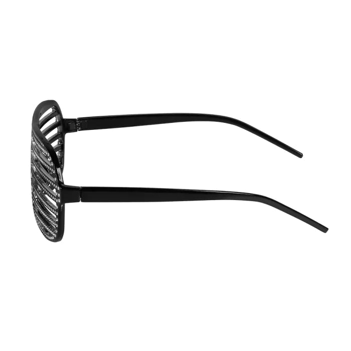 Deze coole shutter partybril is perfect voor festivalgangers, feestbeesten en jaren 90-fanaten. De zwarte lattenfeestbril is versierd met glittersteentjes om wat glamour toe te voegen aan een leuke retro 90's outfit voor Carnaval, een slechte smaakfeestje of verkleedfeestje.