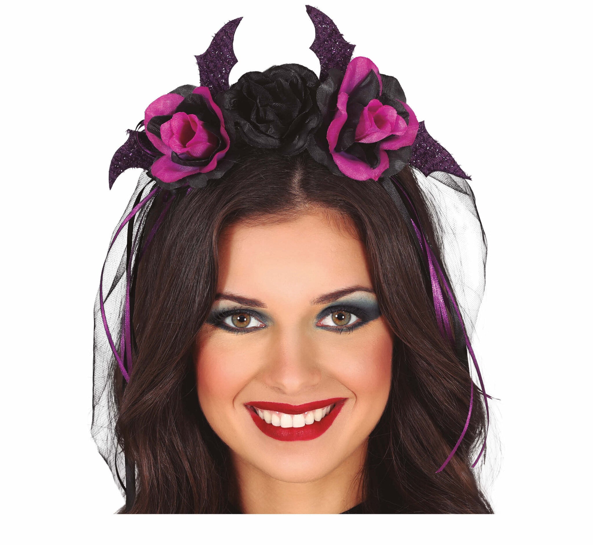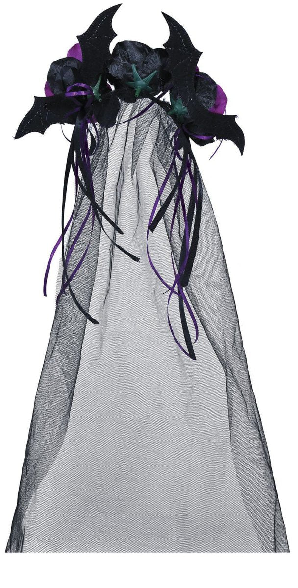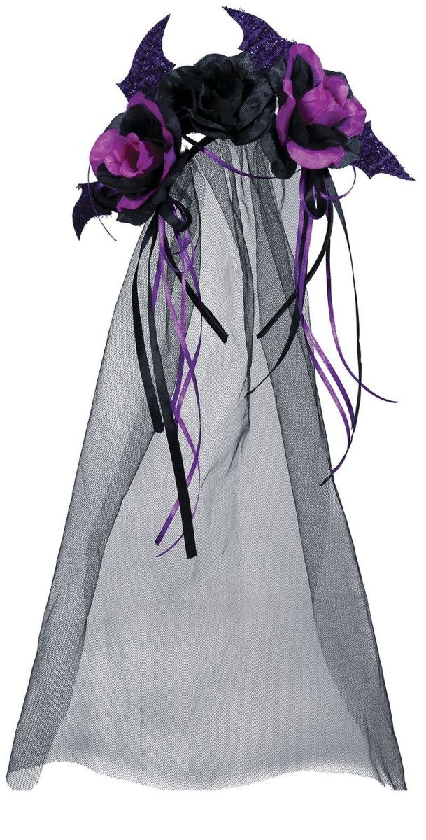 Zwarte Halloween Haarband Paarse Bloemen En Sluier