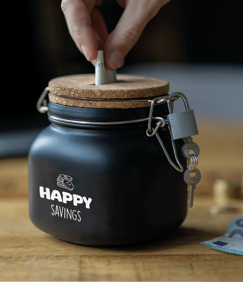 De luxe spaarpotten van Paper Dreams zijn perfecte cadeaus voor bijvoorbeeld Vaderdag, Moederdag of bijvoorbeeld een verjaardag. Deze luxe spaarpot - happy savings is gemaakt van glas en is zwart van kleur.