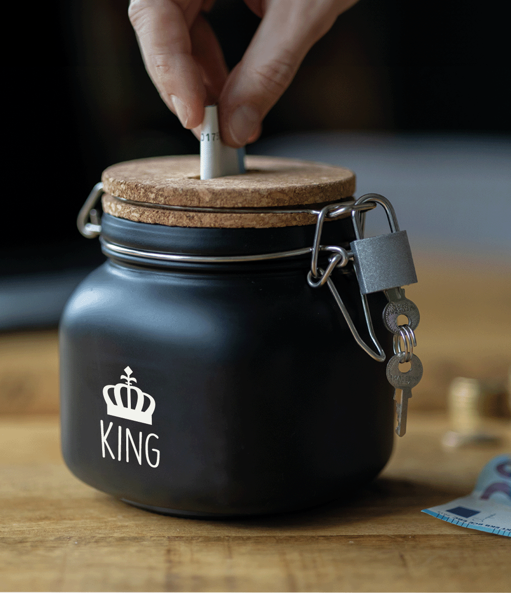 De luxe spaarpotten van Paper Dreams zijn perfecte cadeaus voor bijvoorbeeld Vaderdag, Moederdag of bijvoorbeeld een verjaardag. Deze luxe spaarpot - king is gemaakt van glas en is zwart van kleur.
