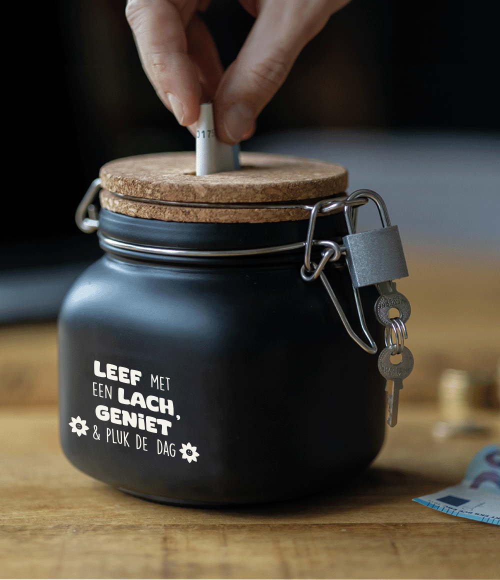 De luxe spaarpotten van Paper Dreams zijn perfecte cadeaus voor bijvoorbeeld Vaderdag, Moederdag of bijvoorbeeld een verjaardag. Deze luxe spaarpot - pluk de dag is gemaakt van glas en is zwart van kleur.