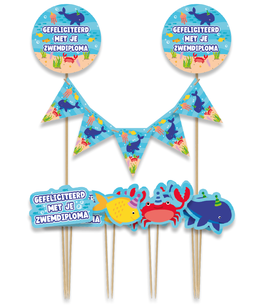 Maak van elke taart een ware blikvanger met deze cake decorations Zwemdiploma! Heeft er iemand zijn of haar zwemdiploma gehaald dan is dit de perfecte decoratie in een taart. De prikkers zijn eenvoudig in de taart of cake te plaatsen voor een opvallend effect.